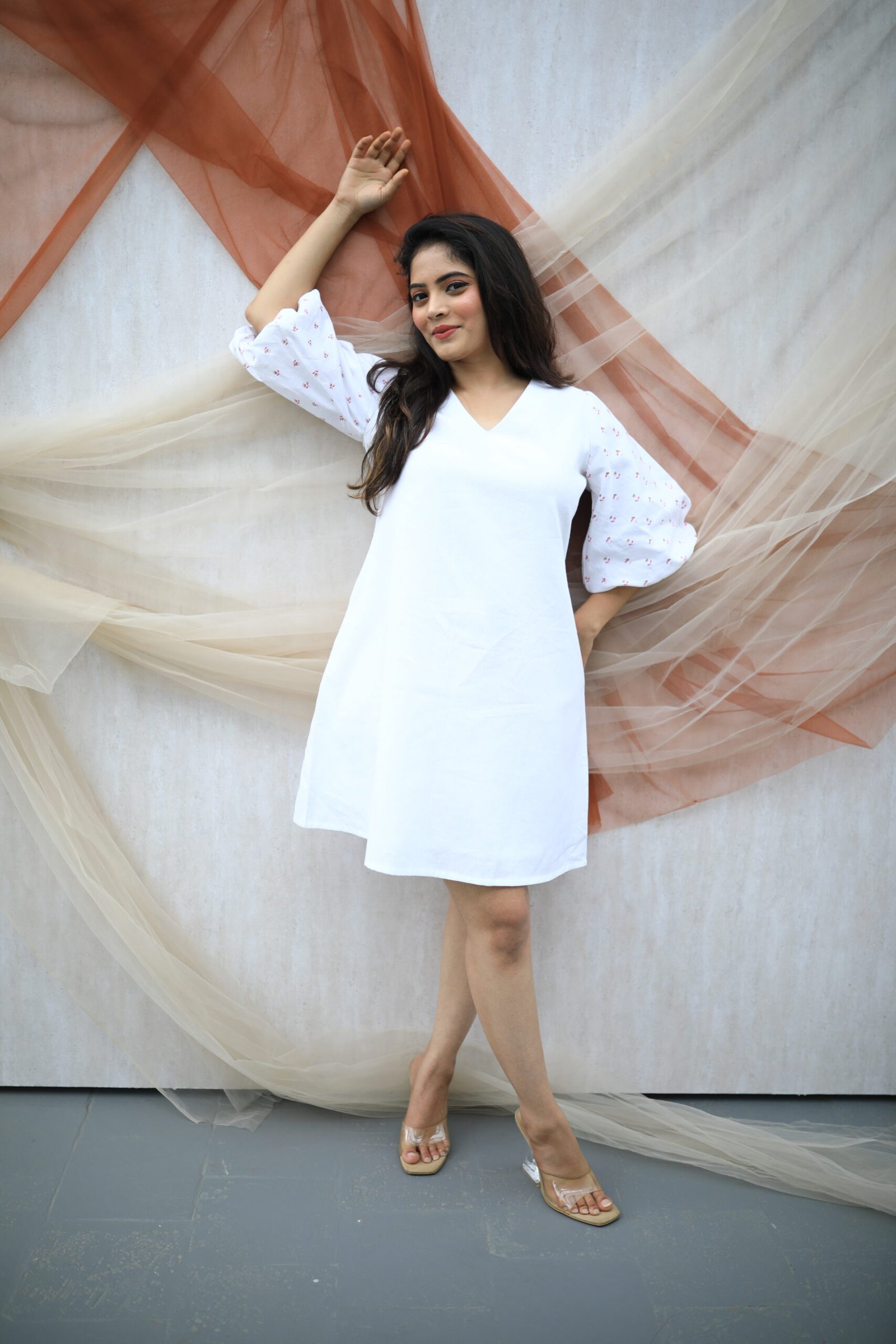 Embrace both style and comfort with this beautiful white linen A-line dress. The dress showcases trendy balloon sleeves and a flattering V-neckline, exuding a sense of charm and femininity. The unique block prints on the sleeves add an artistic touch to the overall design.