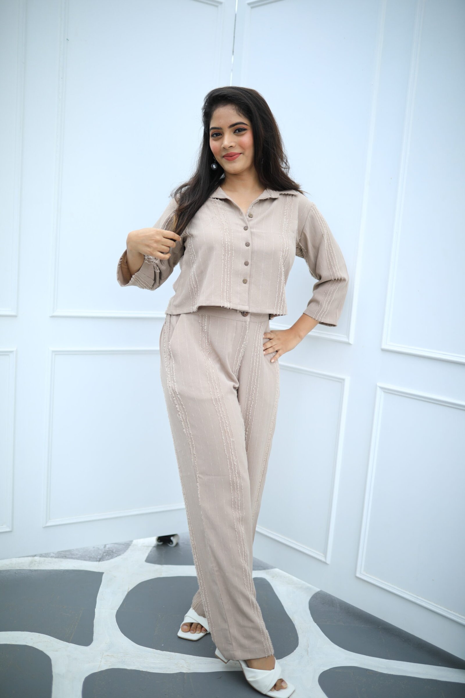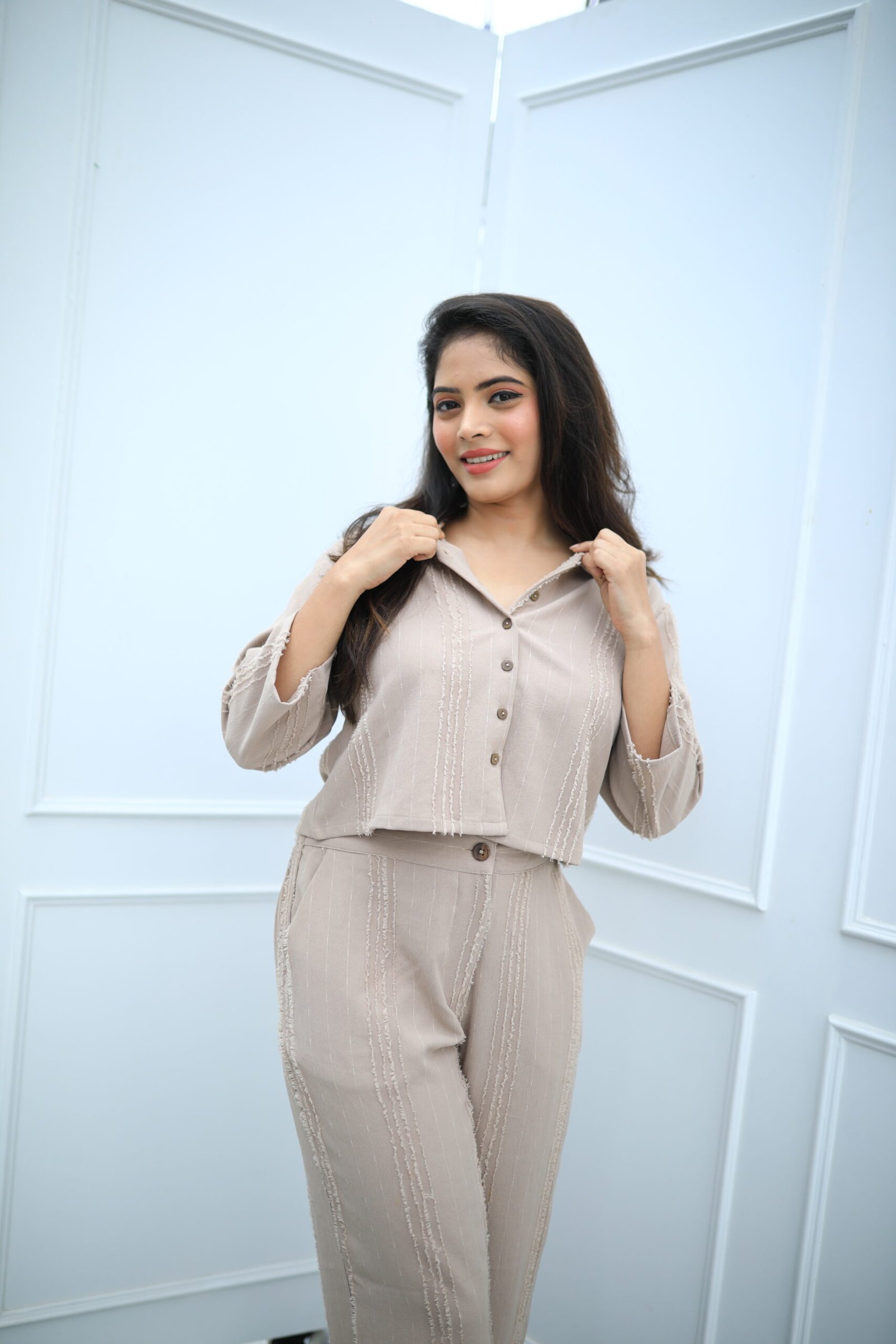 soft, breathable feel. Drenched in a graceful beige hue, this set features a chic crop shirt with a collar neck, 3/4th sleeves, and self-colour stripes that add subtle texture.